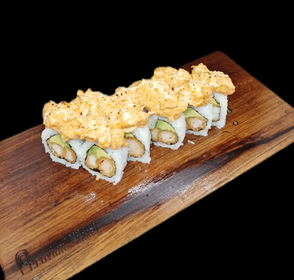 Sushi Roll relleno de langostino crocante y palta, cubierto con calamar salteado en crema de puerro y gratinado con queso parmesano. Una combinación intensa y deliciosa.