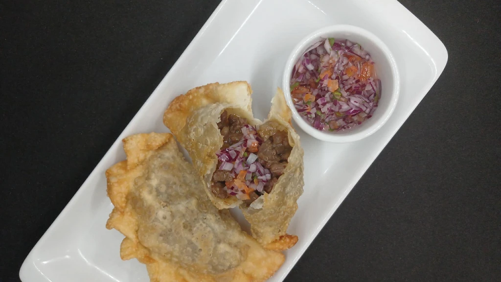 Este plato consta de arrolladitos de lomo, gajos de tomate y cebolla salteados en una salsa de ostras, soja y cilantro. Se sirve con salsa teriyaki para realzar el sabor. ¡Una delicia que no puedes dejar de probar!