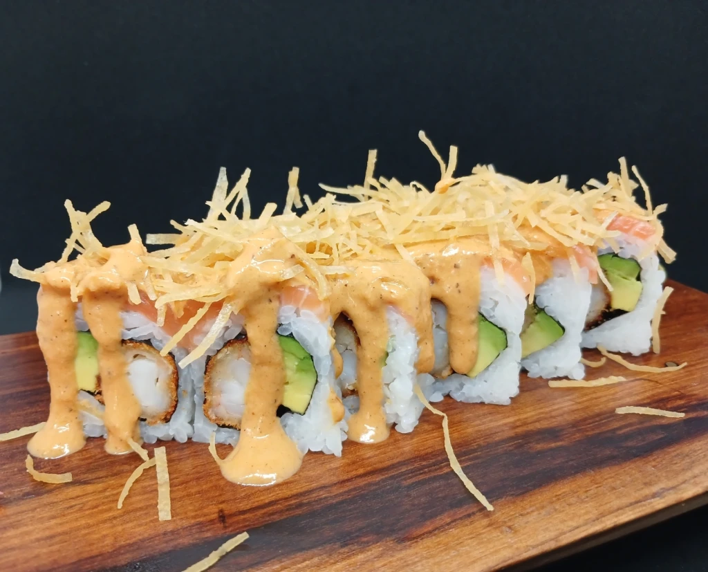 Delicioso sushi roll con langostino crocante, palta; por fuera, fetas de salmón, bañado con una crema de rocoto, decorado con masa philo crocante, ¡una explosión en la boca!